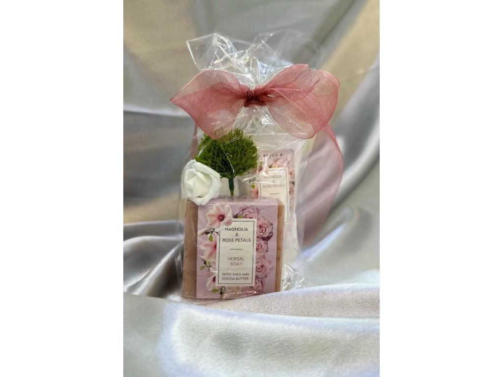 Dárková sada produktů z řady MAGNOLIA & ROSE PETALS: bylinné mýdlo a krém na ruce.